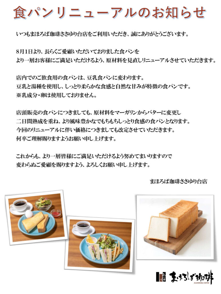 8月1日より当店の食パンがリニューアルいたしましたのでお知らせいたします。